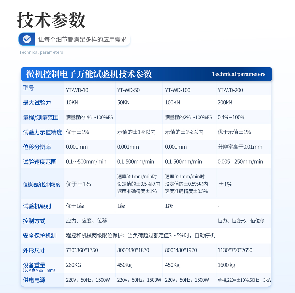設定值<10%fs時,設定值的±1.0%以內>設定值≥10%FS時,設定值的±0.5%以內 | 10、變形速率控制精度: 速率<0.05%fs時為±2.0%設定值內> | 11、速率≥0.05%FS時為±0.5%設定值內 | 12、試驗空間: A.拉伸空間:600mm 壓縮空間:700mm | 13、夾具形式:楔形夾具體(可選液壓加緊) | 14、壓盤尺寸:φ100 mm | 15、整機電源:單相,220V±10%,50Hz,功率:3kW | 16、主機尺寸:1130×750×2650mm | 17、重量:1600 kg |