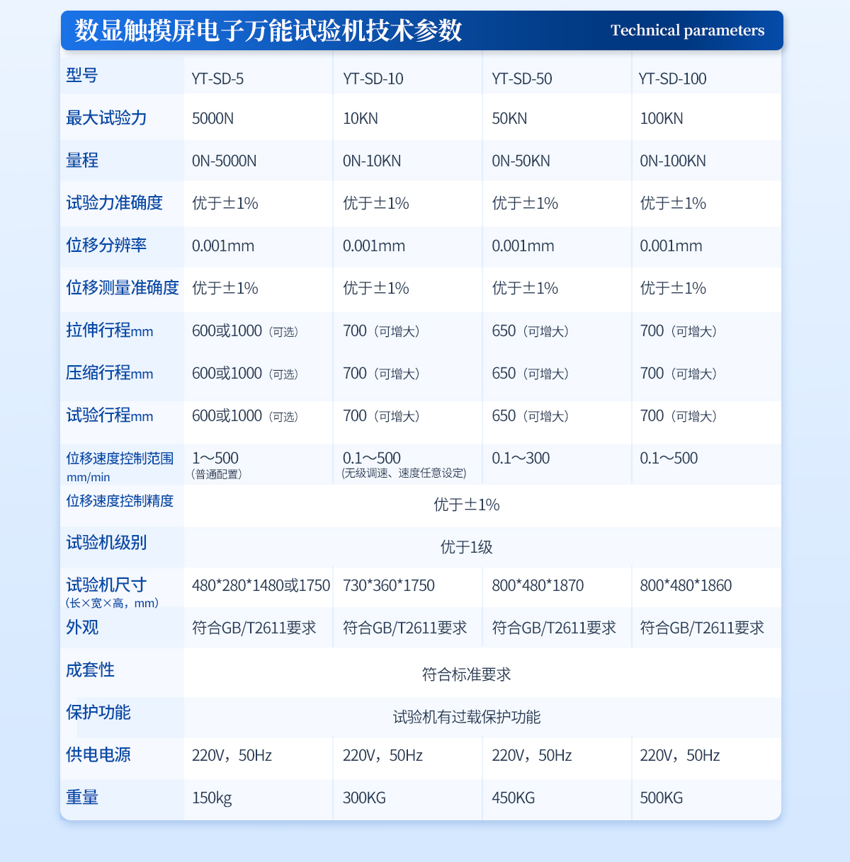 | 1、 **試驗力:5000N ; | 2、 量 程:0N-5000N; | 3、 試驗力準確度:優(yōu)于±1% | 4、 位移分辨率:0.001mm; | 5、 位移測量準確度:優(yōu)于±1%; | 6、 拉伸行程:600mm或1000mm(可選) | 7、 壓縮行程:600mm或1000mm(可選) | 8、 試驗行程:600mm或1000mm(可選) | 9、 位移速度控制范圍:1mm/min~500mm/min(普通配置) | 10、位移速度控制精度:優(yōu)于±1%; | 11、試驗機級別:優(yōu)于1級 | 12、試驗機尺寸:480*280*1480或1750 mm | 13、外觀:符合GB/T2611要求 | 14、成套性:符合標準要求 | 15、保護功能:試驗機有過載保護功能 | 16、供電電源:220V,50Hz | 17、重量:150kg |