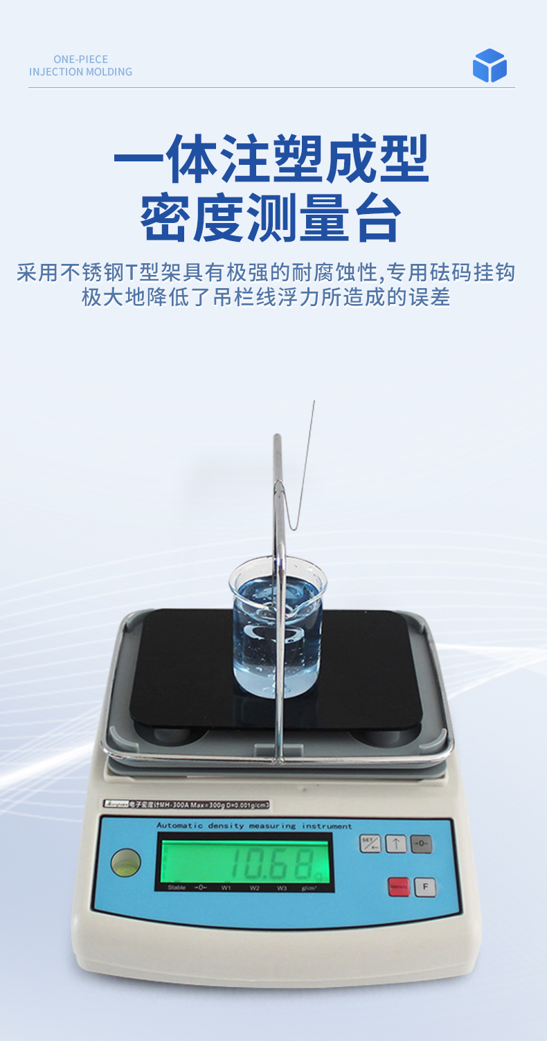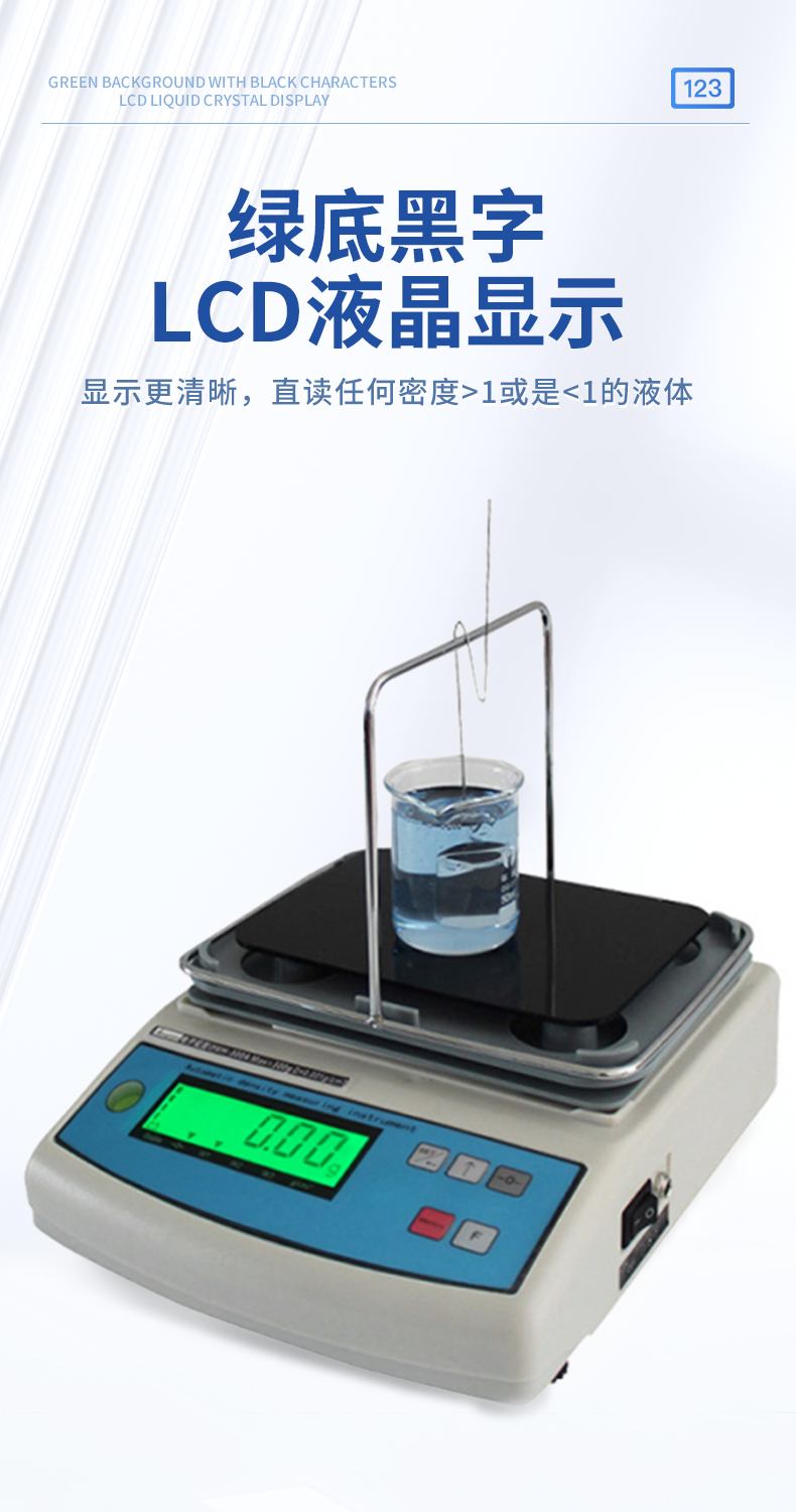 | 1.直讀任何密度>1或是<1的液體.> | 2.具有溫度補償設定、溶液補償設定功能,更人性化的操作、更符合現(xiàn)場作業(yè)需求 | 3.密度測量臺一體注塑成型,安裝方便快速,使用時間更長. | 4.采用不銹鋼T型架具有極強的耐腐蝕性,專用砝碼掛鉤極大地降低了吊欄線浮力所造成的誤差 | 5.具有密度上、下限功能,可判定待測物的比重合格與否。設有蜂鳴器裝置 | 6.內置蓄電池,選配防風罩,更適合現(xiàn)場測試. | 7. 綠底黑字LCD液晶顯示,顯示更清晰 |